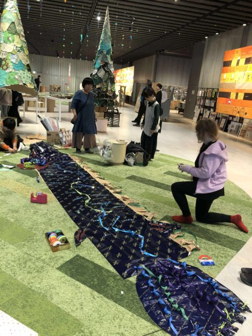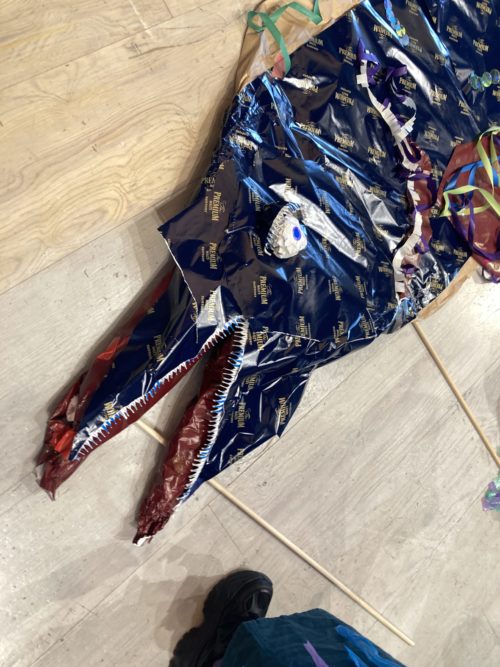 ・私はちょっと前に見てたら誘われて、それでやってみよっかなって。それで、巨大魚の尻尾らへんを作ってまして、今日来て頭を動かして、なんかすごいなって。いろんな人が、いろいろやって成り立ってるんだな、みたいな。正直、自分もいろんな生物とか作っては見たんですけど。ナマコ、サンマ、謎生物、これが私が作った3個のものでした。他の方のものを見てると「すごいな、こっちの方がうまいんだろうな」と自分で他の人と比べちゃった。だから、「みんな作るのうまいな」というのがいちばんの感想でした。