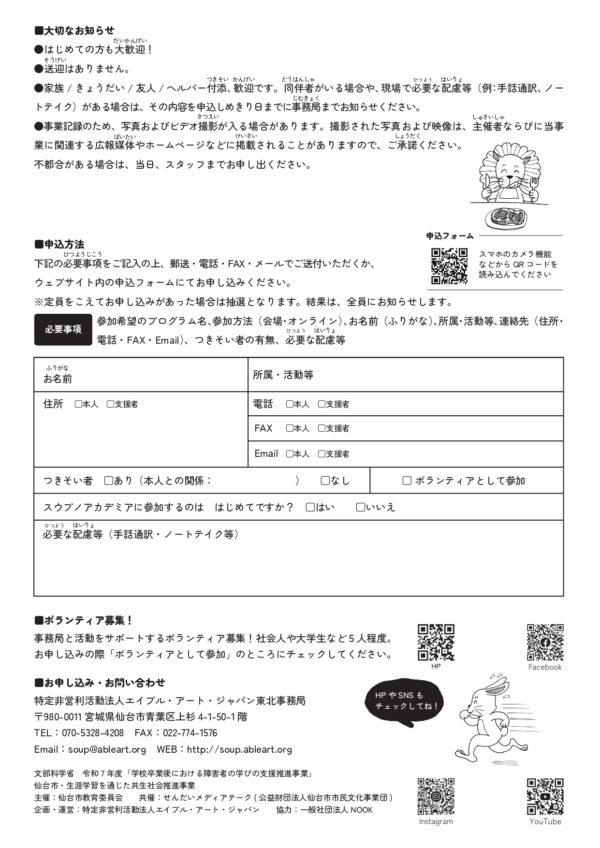 ●家族/きょうだい/友人/ヘルパーの付き添いも歓迎です。同伴者がいる場合や、現場で必要な配慮等(例:手話通訳、ノートテイク)がある場合は、その内容を申込しめきり日までに事務局までお知らせください。
